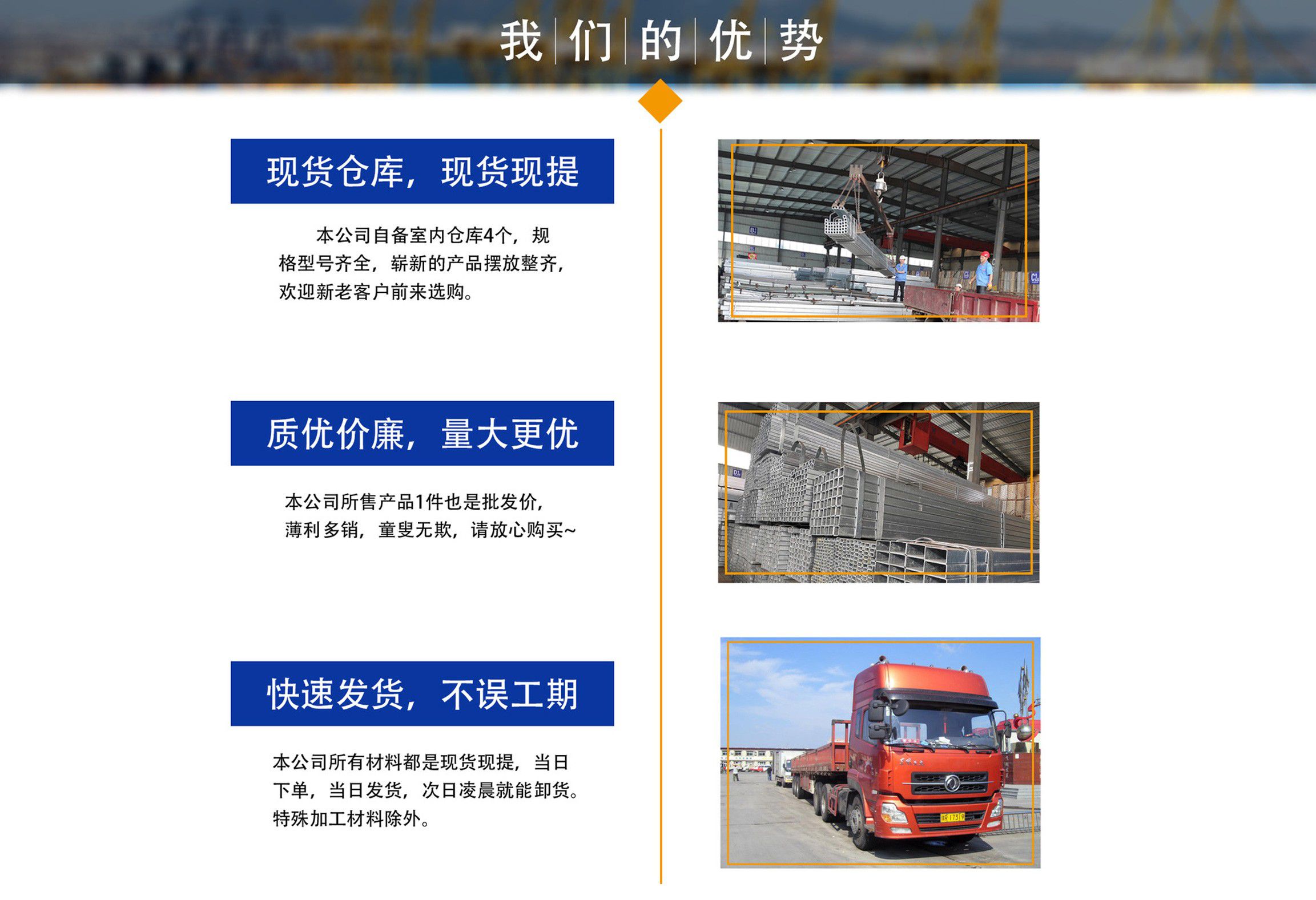 天津鍍鋅方管廠位于天津市靜海大邱莊工業(yè)區,交通便利,地理位置優(yōu)越。我廠占地面積近9000平方米,注冊資金1000萬元,主要從事鍍鋅方管,鍍鋅方矩管,熱鍍鋅方管,鍍鋅方管廠家等產品的生產及銷售,現生產設備已擴大到六條,年生產量十萬噸左右占地面積近兩萬平米。銷售網絡遍及全國,受到廣大用戶認可。公司恪守以誠信為本,立業(yè)為眾的經營理念,以可靠的質量、合理的價格、優(yōu)質的服務、卓絕的信譽、期待您的關注和支持。 公司庫存量大,材質規(guī)格齊全,沒有規(guī)格及特殊規(guī)格材質方管可及時定貨生產,我公司經營方式靈活,批零兼營、一支起售,并可為客戶辦理鐵路、公路運輸,7*24小時為您服務,歡迎新老客戶來電垂詢。 公司一直堅持“以質量求生存,以產品求發(fā)展,以信譽保合作,以服務贏客戶”的經營方針,客戶遍及大江南北,獲得了良好的聲譽與回報,在以后的發(fā)展歷程中,我們愿與廣大客戶攜手并進,共創(chuàng)輝煌。 熱忱歡迎新老客戶蒞臨指導、洽談業(yè)務!...